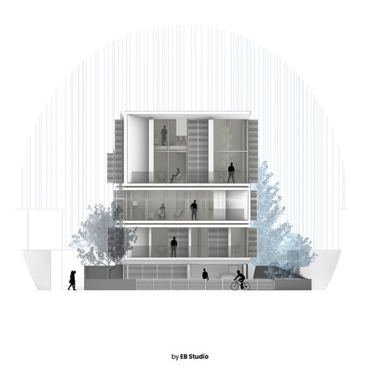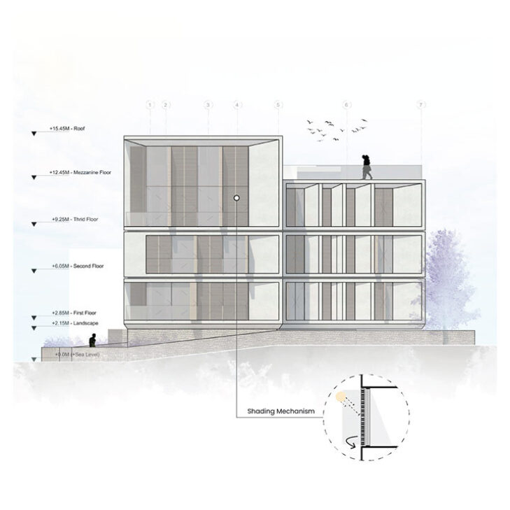 The building embraces traditional Cypriot house balconies, allowing residents to embrace the views of the site. Located at the living areas, the balconies serve as an extension of the interior space. Fully operable glazing seamlessly integrates the balconies with the building’s interior, providing residents with a contemporary living experience. Inspired by the importance of balconies in Cypriot neighbourhood life, the project incorporates this element as a central design feature.