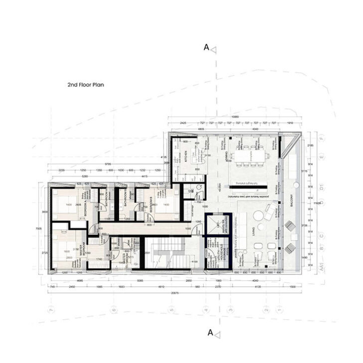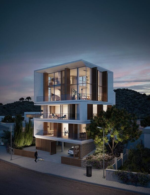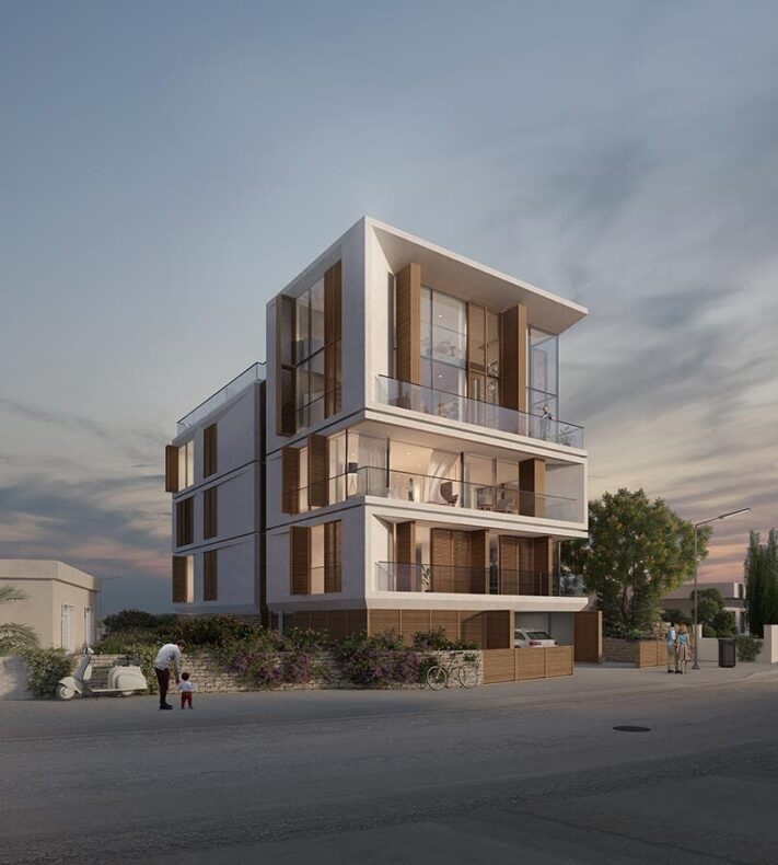 Blending contemporary modern living with elements of traditional Cypriot architecture, the design draws inspiration from the geometric expressions found in the old streets of Larnaca. The ground floor incorporates stone cladding, enabling the building to harmonise with the site, landscape, and neighbourhood, while also dividing it into two distinct volumes. Subtle gestures highlight the outlines of the larger module, providing individual character to each flat and emphasising an intimate residential experience.