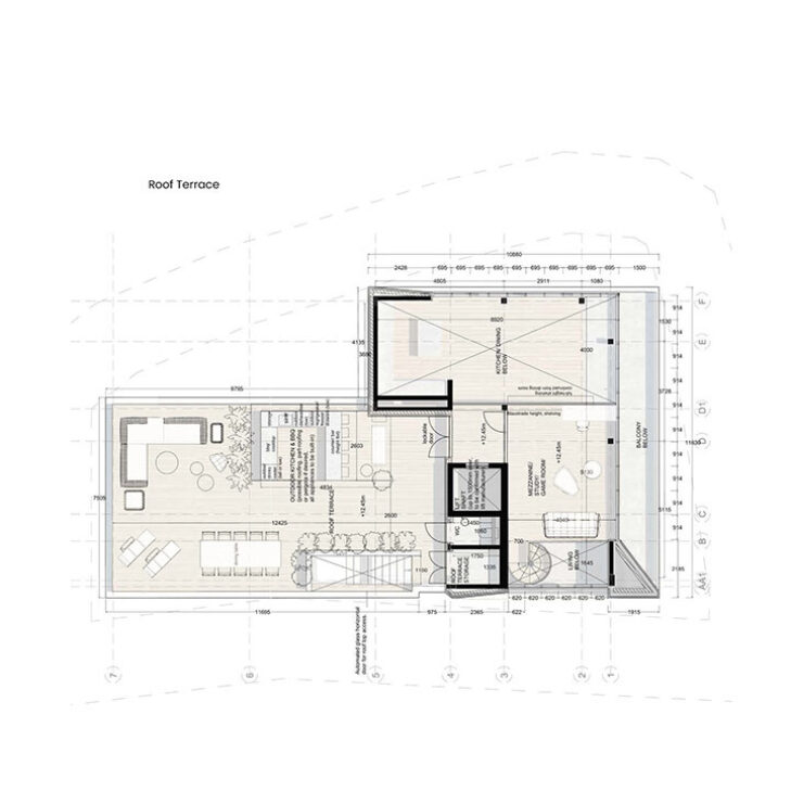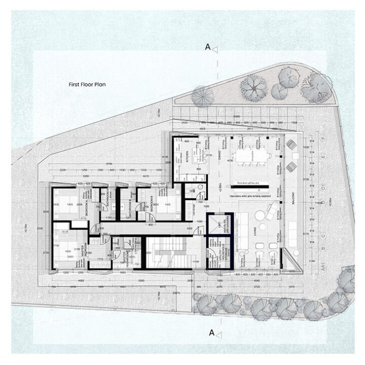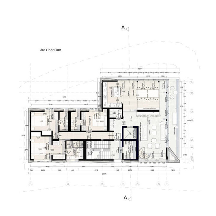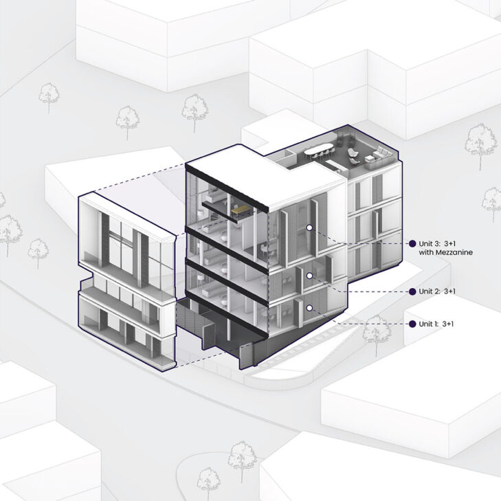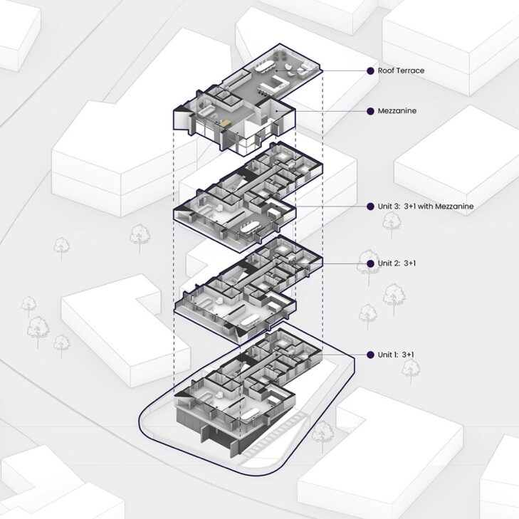 The project consists of a three-story family apartment building, featuring two flats with three bedrooms each and a top-floor apartment with three bedrooms and a mezzanine level. All apartments offer two ensuite rooms and a master bedroom, along with open-plan kitchen, dining, and living areas. The rooftop garden is accessible to all residents, creating a shared outdoor space.